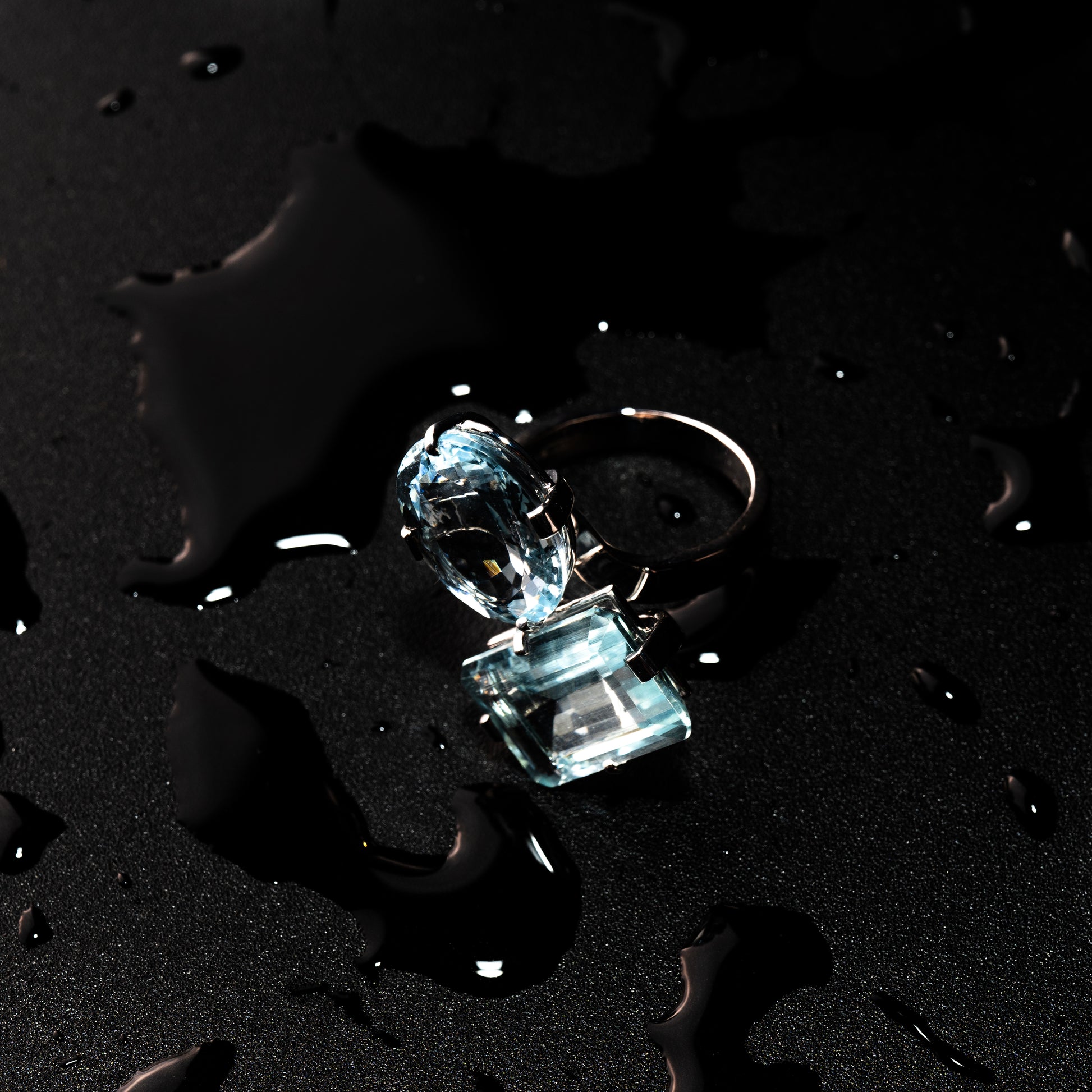 Anello minimalista, intramontabile classico con due gemme Acquamarina naturali, montate con oro bianco 750.