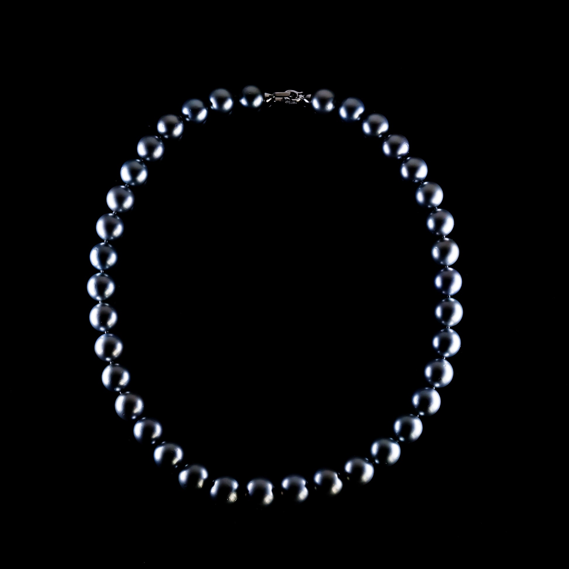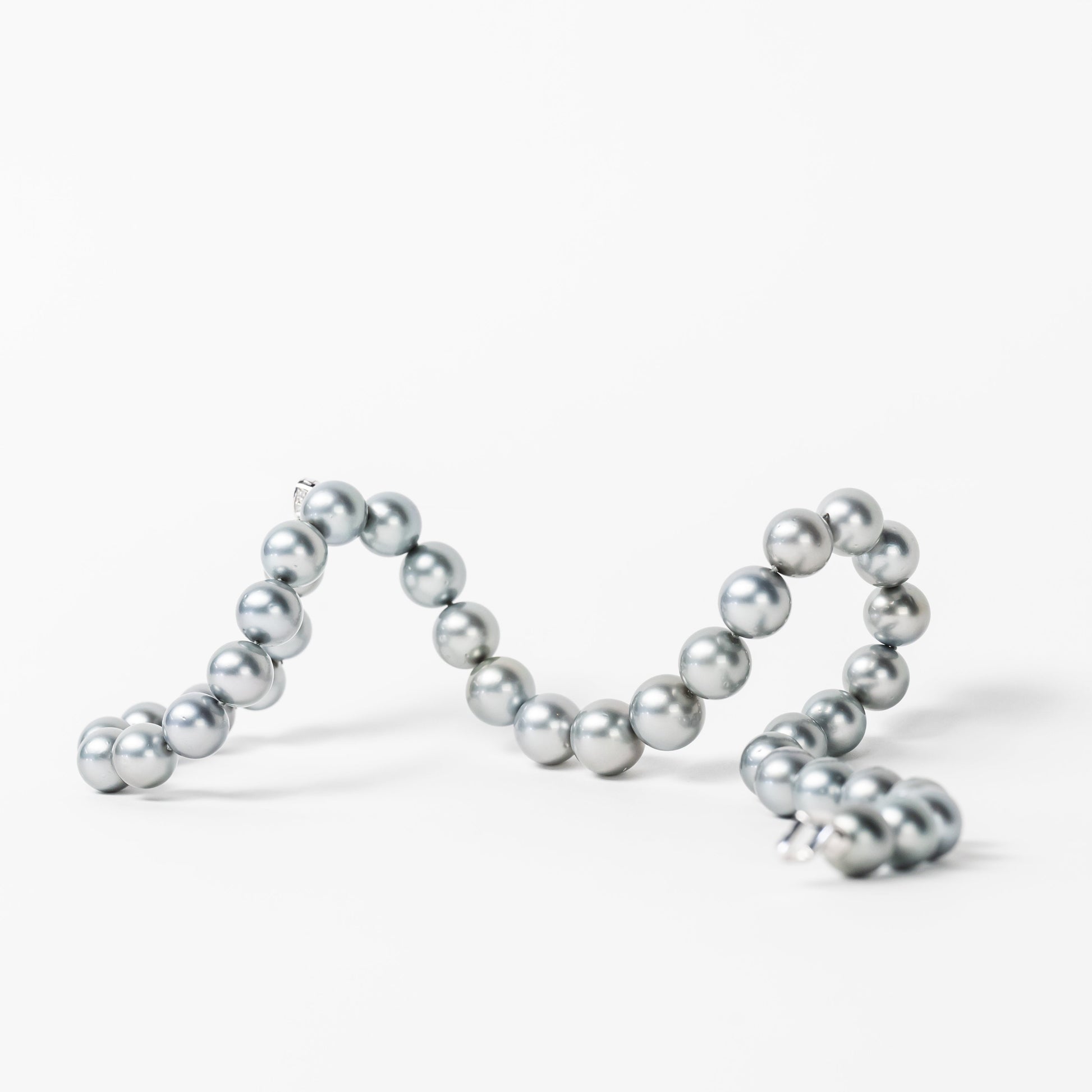 La loro superficie appare perfettamente sferica e liscia, con una lucentezza speculare che riflette la luce in modo puro e nitido. Il colore argenteo-grigio con riflessi freddi dona alla collana un carattere contemporaneo e sofisticato.