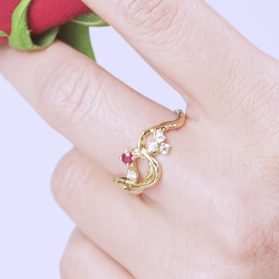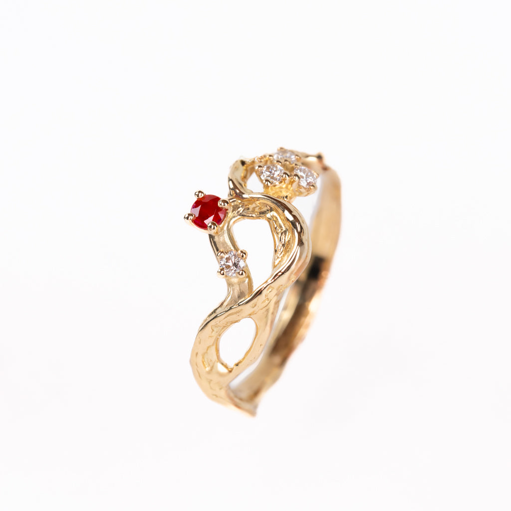 Realizzato in oro 750, impreziosito con un Rubino naturale centrale e con Diamanti naturali.