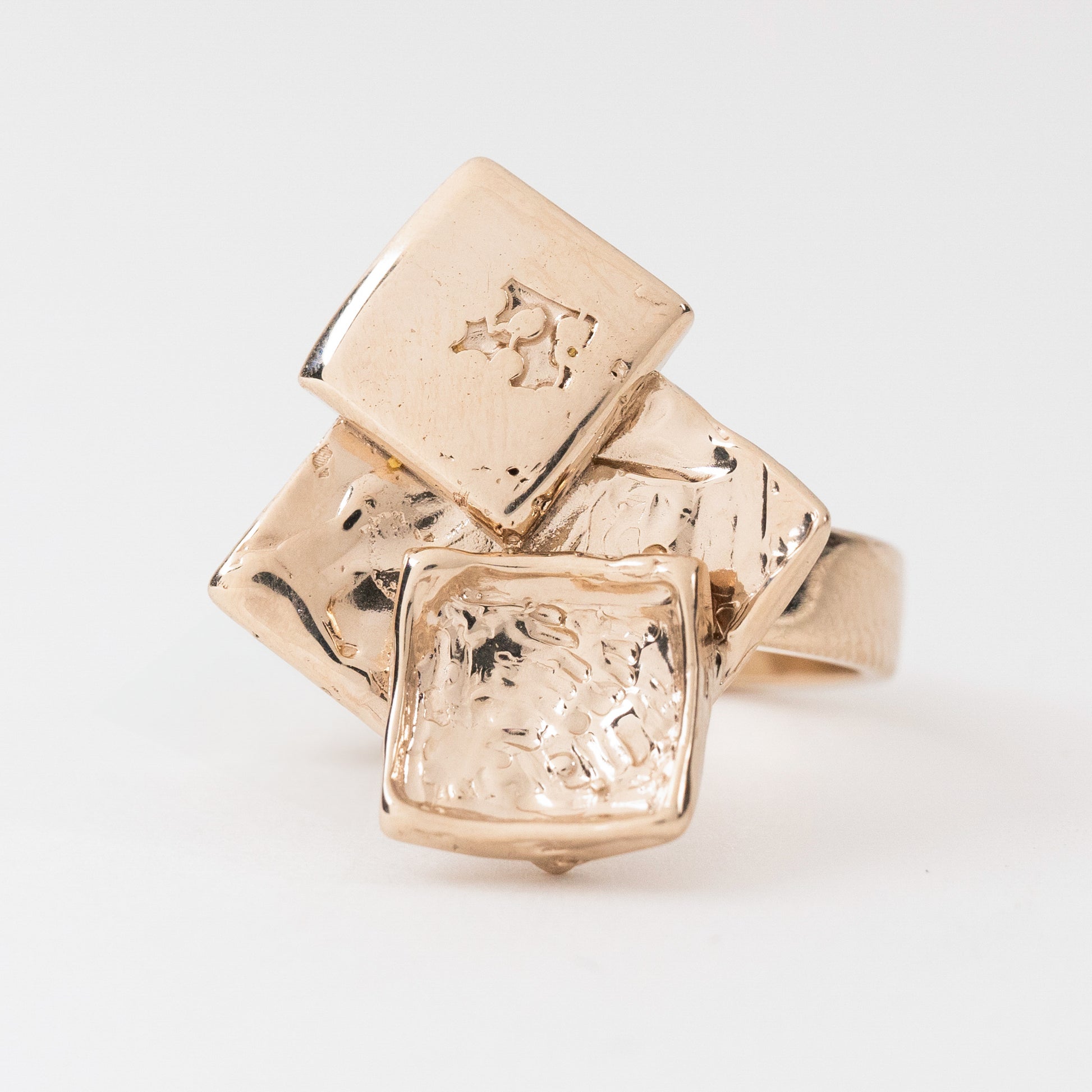 Tre anelli in oro 750 champagne, scolpiti a mano, dove elementi geometrici incontrano forme astratte in un equilibrio dinamico.